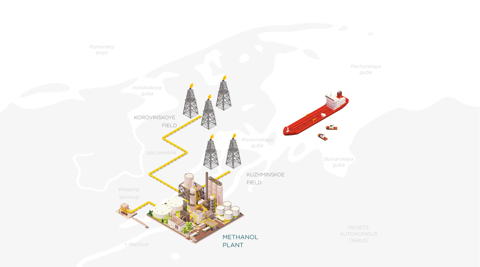 The gas condensate resource hubs are planned on the basis of Kumzhinsky and Korovinsky gas-condensate fields in the Nenets Autonomous Area. Also, RUSCHEM is considering construction of a methanol plant with associated export-oriented seaport infrastructure.